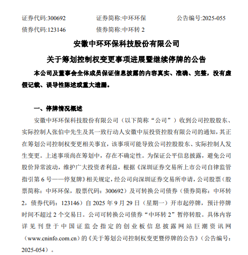 10月8日,中环环保(300692.SZ)发布关于筹划控制权变更事项进展暨继续停牌的公告,其控股股东、实际控制人张伯中及其一致行动人正在筹划公司控制权变更相关事宜,该事项可能导致公司控股股东和实际控制人发生变更。为避免股价异常波动,维护投资者利益,其自2025年9月29日起停牌,预计停牌时间不超过2个交易日。