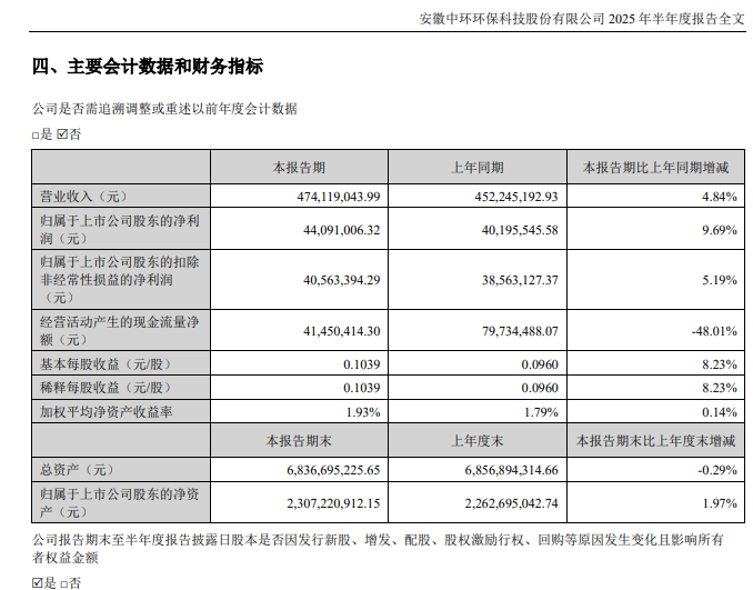 半年报显示,2025年上半年,中环环保营业收入为4.74亿元,同比上升4.84%;归母净利润为4409万元,同比上升9.69%;扣非归母净利润为4056万元,同比上升5.19%;经营现金流净额为4145万元,同比下降48.01%。