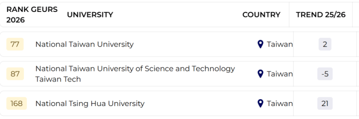 台湾地区的台湾大学、台湾科技大学进入榜单前100,国立清华大学表现出色,跃升21位。