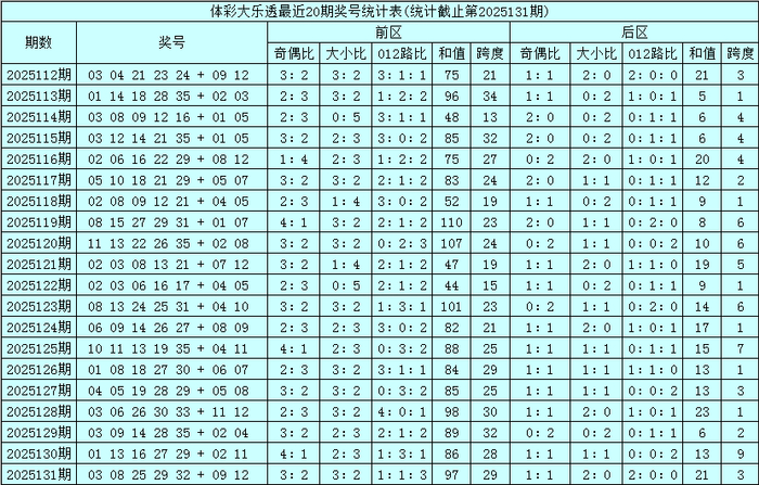 大乐透第2025131期开奖号码为:03、08、25、29、32+09、12。其中前区奖号奇偶比为3:2,大小比为3:2,和值为97,跨度为29,后区奖号奇偶比为1:1,大小比为2:0。