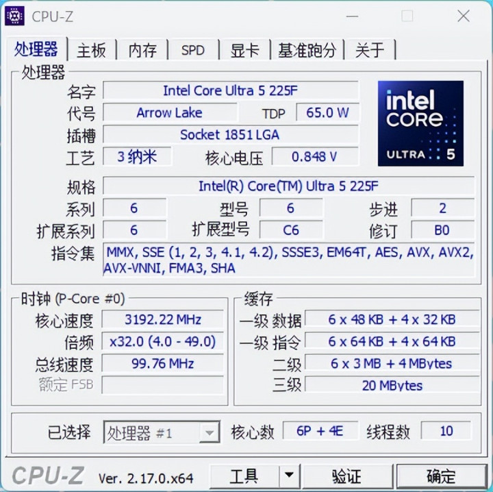 处理器:酷睿Ultra5处理器225F(10核10线程,最大睿频4.9GHz)