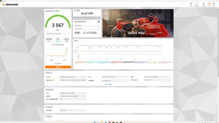 在针对全景光追游戏性能测试的Speed Way中,华硕天选6X台式机所搭载的RTX 5060显卡取得了3567分的成绩,这表明它能够较好地应对1080p分辨率下的光追游戏。