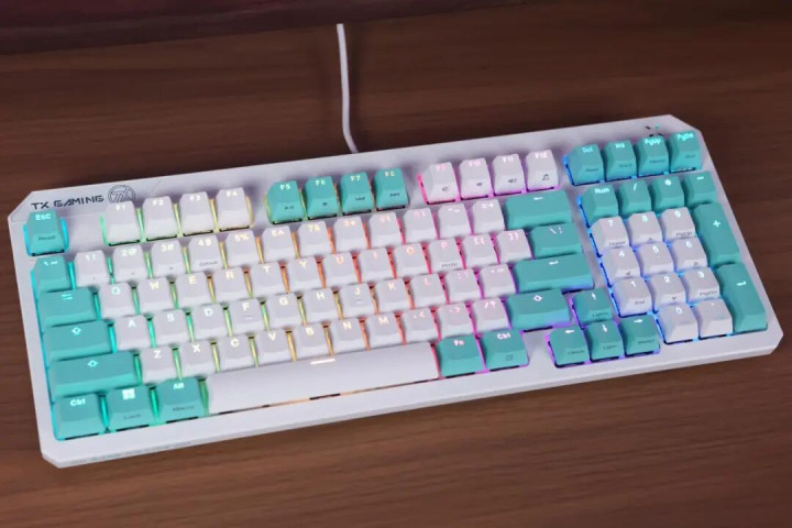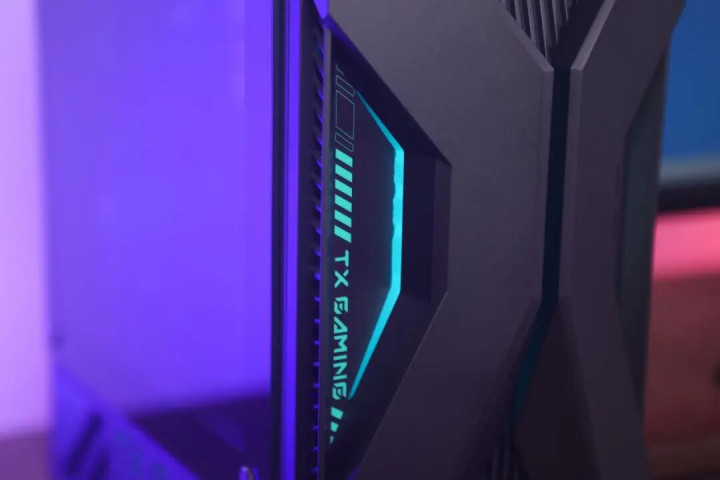 ▲左侧进风口外侧印刻了科幻风的青蓝色TX GAMING字样,且在面板装甲处加装了背光灯带。