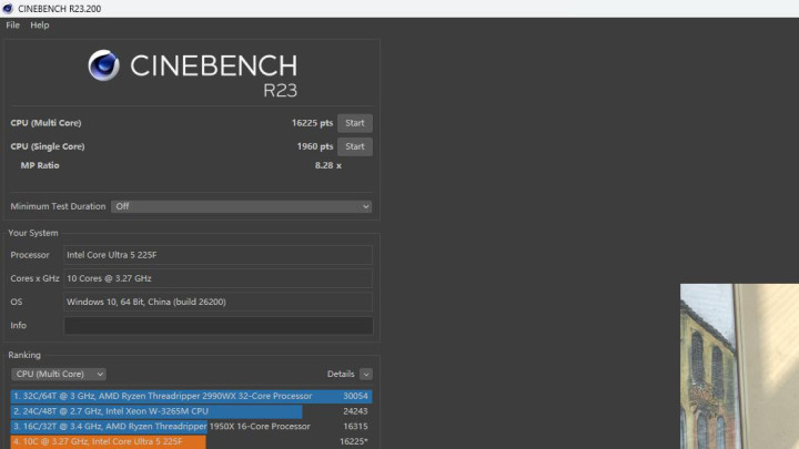 处理器方面,我们评测的这款华硕天选6X配备了酷睿Ultra5处理器225F。该处理器基于Arrow Lake架构,并采用了台积电的N3B制程技术。同时,它还采用10核心(6个性能核、4个能效核)10线程的混合架构设计,最高可实现4.9GHz的睿频加速,拥有20MB缓存,处理器基础功耗为65W,性能和能效管理能力兼得。同时,其内置了一颗拥有13 TOPS的NUP。为全面验证酷睿Ultra5处理器225F的综合运算实力,我们选取Chinbench R23、7-ZIP benchmark、CPU-Z bench及V-Ray benchmark四款测试工具,对华硕天选6X台式机展开系统性CPU性能测试。测试前,我们通过华硕专属的Armoury Crate控制中心,将整机调至增强模式,确保处理器与整机硬件均能突破性能限制、全力释放潜能(后续所有测试均基于该模式严谨开展,以保障数据的客观性与参考价值)。测试结果表明,酷睿Ultra5处理器225F的性能表现名副其实,完全能够从容应对主流分辨率下的游戏负载需求,以及轻度生产力创作的多任务处理场景,展现出全能均衡、够用且优的核心特质。