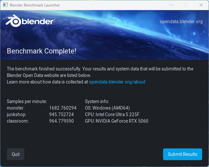 华硕天选6X的应用范畴不仅局限于游戏领域,还能够为用户的生产与创作提供助力。在该环节,我们挑选了Blender Opendata、V-Ray Benchmark、UL Procyon等多款软件对华硕天选6X进行了创作性能方面的测试。在Blender Opendata的Monster、Junkshop、classroom三项测试中,华硕天选6X分别得到了1683、946、965分,能够很好地应对轻量级模型渲染需要。