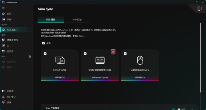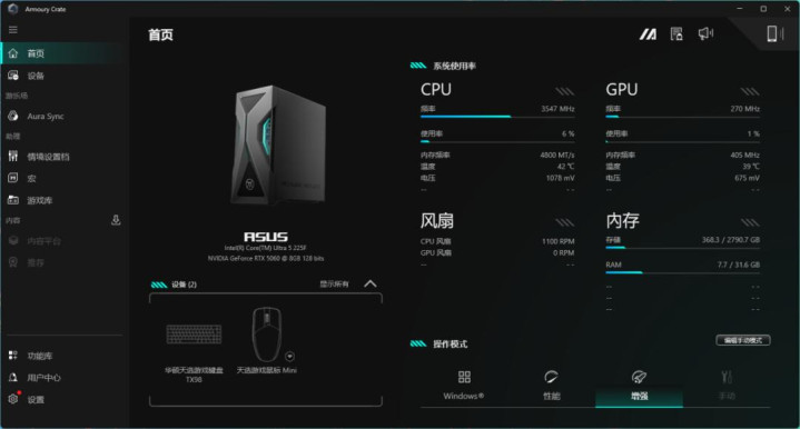 华硕天选6X台式机搭配的Armoury Crate监控应用程序也是这款产品强大的后勤支持。搭配它之后,玩家可以随时监控华硕天选6X台式机的性能状态,包括风扇速度、CPU与内存使用率、下载/上传状态等,Armoury Crate监控应用程序都能详实地将其呈现。不仅如此,Armoury Crate监控应用程序还支持华硕天选6X台式机与旗下外设达成神光同步,令整个桌面将实现整齐划一的格调,简单而又朴素的桌面也会变得熠熠生辉起来。最重要的是,Armoury Crate监控应用程序还可以运行玩家对华硕天选6X台式机的性能模式进行调整,从而使得该PC能够更好地适应不同场景。