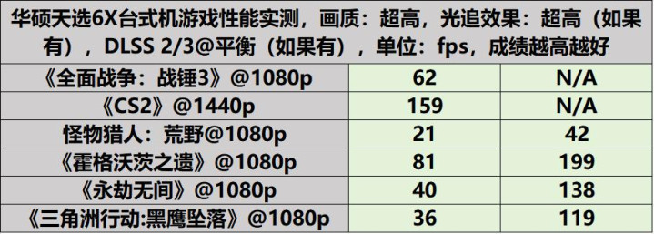 根据游戏实测,我们可以看到在本次测试的数款游戏中,华硕天选6X台式机在不启用DLSS的情况下能够以相对较为流畅的帧率把玩不支持光追效果游戏,比如《全面战争:战锤3》《CS2》。而在面向《永劫无间》《三角洲行动:黑鹰坠落》这类支持光追效果的电竞网游时,在利用DLSS 2/3@平衡模式的情况下,华硕天选6X台式机也能够以超过100fps的帧率流畅进行游戏体验,这点值得肯定。