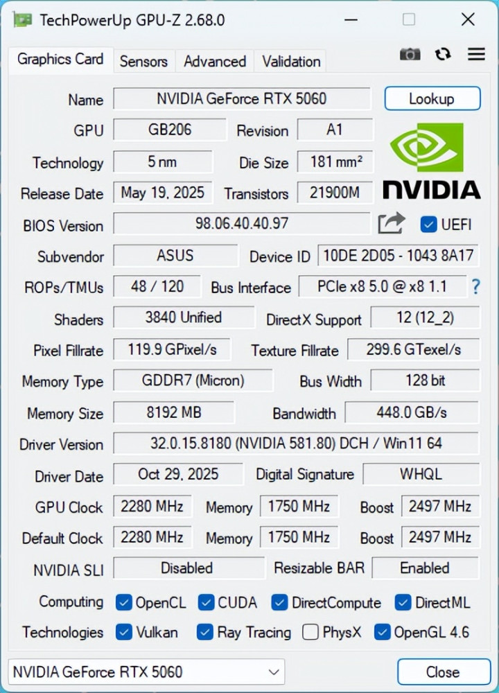 ▲显卡型号为华硕DUAL RTX 5060 8G