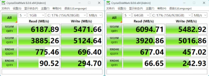 CrystalDiskMark测试数据显示,华硕天选6X台式机搭载的1TB PCIe 4.0 SSD的顺序读取性能逼近6100MB/s,顺序写入性能稳定在 5450MB/s以上,如此高速的读写能力,让大型光追3A游戏的安装与加载过程大幅缩短,显著提升游戏体验的连贯性;同时,在1GiB与64GiB两种测试模式下,其性能成绩相差不大,充分印证了该SSD在不同文件大小、不同负载场景下的稳定性与一致性,无论是传输单个大型设计素材,还是批量移植多组游戏文件,都能保持高效输出,避免出现传输大文件时“掉速”的尴尬情况。