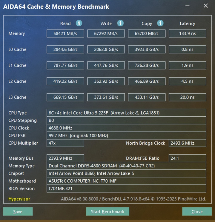 华硕天选6X台式机配备32GB DDR5 4800MHz双通道内存并预留了扩展空间,这一配置既满足了主流玩家对多任务运行的需求,又为未来升级预留了充足空间。从测试结果来看,该内存的性能表现中规中矩,完全符合DDR5内存的主流水准:读取性能达58421MB/s,写入性能高达67292MB/s,延迟控制在133.9ns。高读写速度意味着游戏加载时的资源调用、多任务切换时的数据缓存均能实现流畅操作,有效避免因内存瓶颈导致的画面卡顿或操作延迟;而稳定的延迟表现,则进一步保障了游戏中的瞬时响应精度,让玩家在竞技对抗中占得先机。