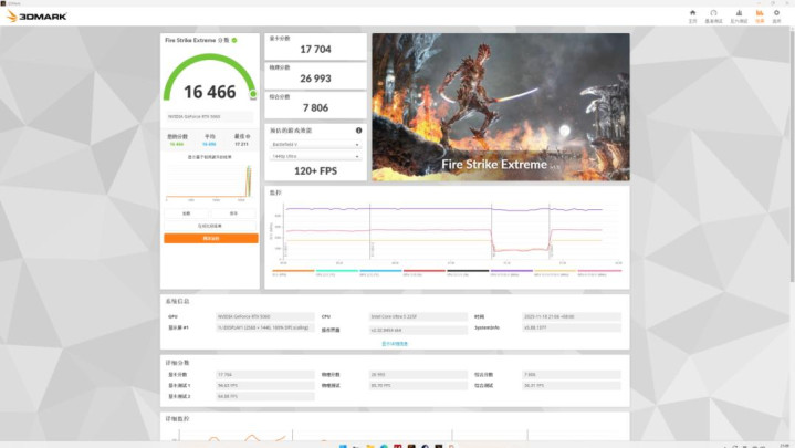 在3DMARK基准性能测试环节,我们首先考察了华硕天选6X台式机搭载的RTX 5060于Fire Strike Extreme中的表现——可以看到,其显卡分数达到了17704,根据我们的经验来看,其性能较RTX 4060的领先能够达到20%以上。