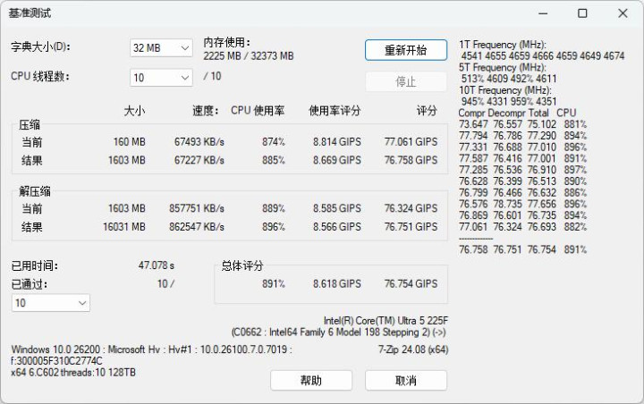 此外,在聚焦压缩与解压缩性能的7-ZIP benchmark 测试中,该处理器以76.754 GIPS的总体评分,展现出高效的数据处理能力,无论是日常文件归档、游戏安装包解压,还是大型素材传输,都能大幅缩短等待时间,提升用户的实际使用效率,让操作流程行云流水。综合各项测试数据不难看出,华硕天选6X搭载的酷睿Ultra5处理器225F的性能输出精准适配主流用户的核心需求,既没有因性能过剩造成资源浪费,也没有因规格不足导致体验打折,完美诠释了这台“小钢炮”的“攒机”思路。