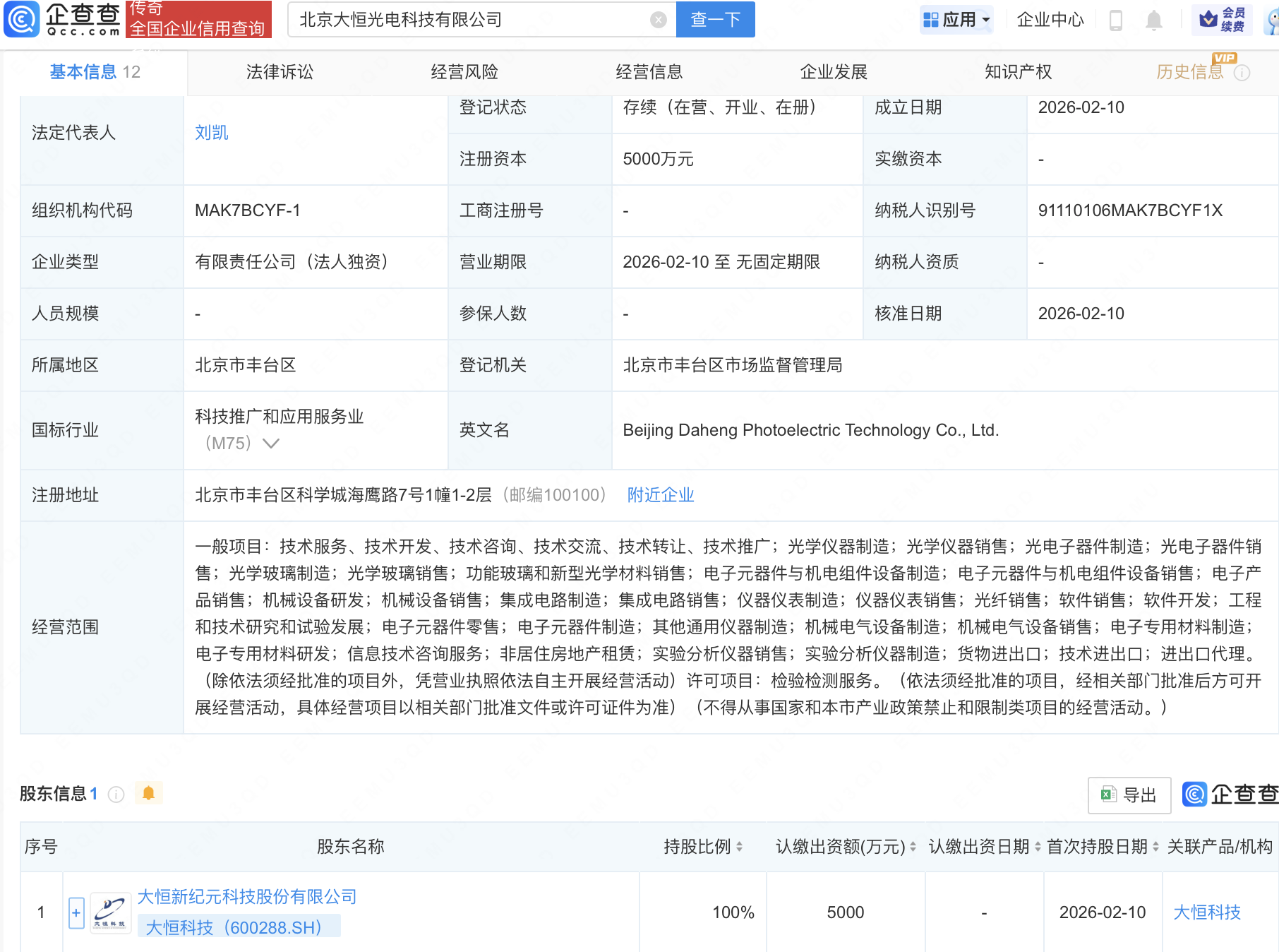 近日,北京大恒光电科技有限公司成立,注册资本5000万元,经营范围包含:集成电路制造;集成电路销售;仪器仪表制造;仪器仪表销售;光纤销售等。企查查股权穿透显示,该公司由大恒科技(600288)全资持股。