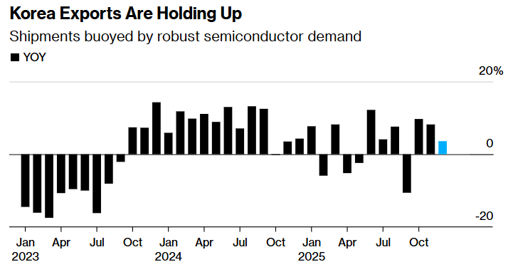 韩国强劲的半导体出口继续掩盖其他行业的疲软,帮助维持了12月前几周的整体出货额增长,韩国目前正在应对美国关税的影响。根据韩国海关周一公布的数据,经工作日差异调整后,12月前20天的出口额同比增长3.6%,上个月同期增速为8.2%。相比之下,11月份全月出口额修正后增幅为13%。未经调整的出口量也增长了6.8%,而整体进口增长了0.7%,促使贸易顺差达到38亿美元。